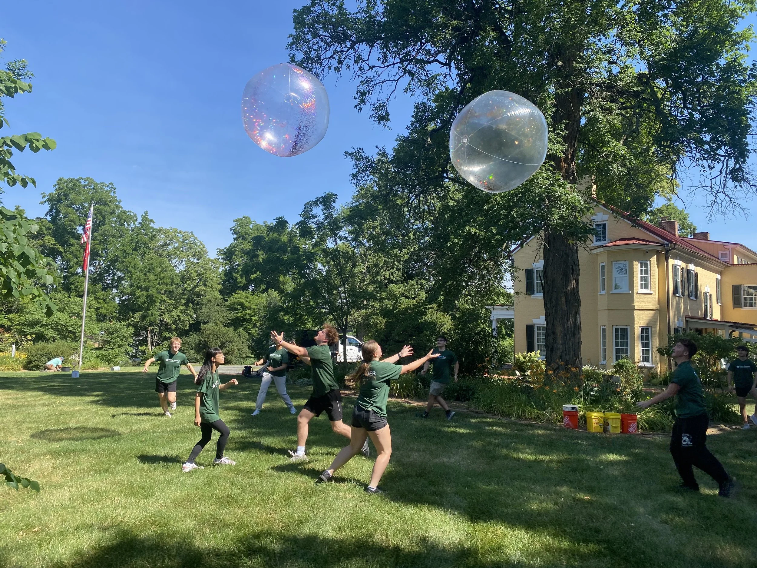 Tuesday morning opened with a series of teambuilding games. The students divided into four teams and competed against each other in a Mini-Olympics, culminating in an epic battle to move a giant ball across the lawn while keeping it in the air the whole time. After a break for lunch, students worked together to assemble, paint and install Dodona Manor’s first ever Little Free Library.
